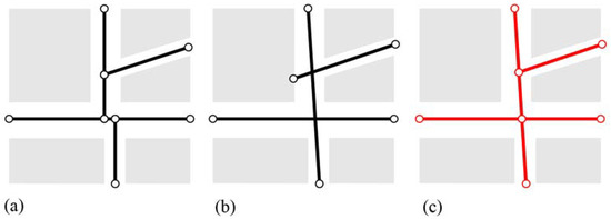 Various street network representations used to represent the street network in the ASA model: (a) Street center line; (b) Axial map; (c) Segment map.