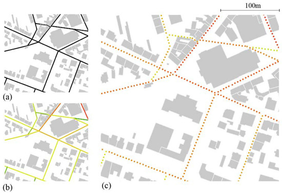 Discretization of the street network: (a) Segment map; (b) Betweenness R600 (red = high Betweenness, green = low Betweenness); (c) Street network discretized to evenly distributed points (at 5 m distance).