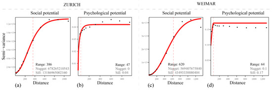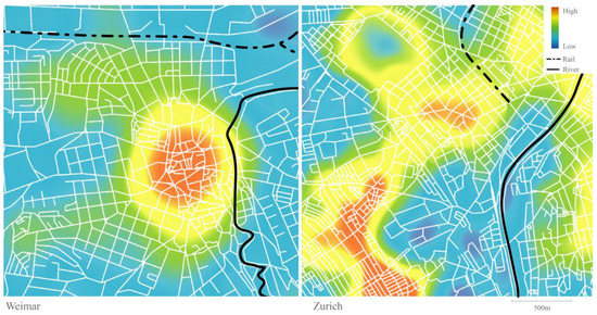 The resulting maps reveal the spatial patterns of social potential as defined by the street network configuration (see Figure 4). In both case studies, we can observe a strong influence of natural and infrastructural barriers on the distribution of social potential, i.e., rivers and railroads are dividing both areas in the two cities not only physically, but also socially. Similarly, both cities share a rather irregular geometrical form of the social accessibility distribution. Beside these common patterns, both cities differ strongly in the number of centers accumulating social potential. Here, Weimar can be described as mono-centric with the highest values of social potential in the historical core, which are then irregularly dispersed towards the outskirts. In contrast, Zurich reveals a more polycentric pattern with the main centers being interconnected with continuous stripes of neighborhoods with high social potential.