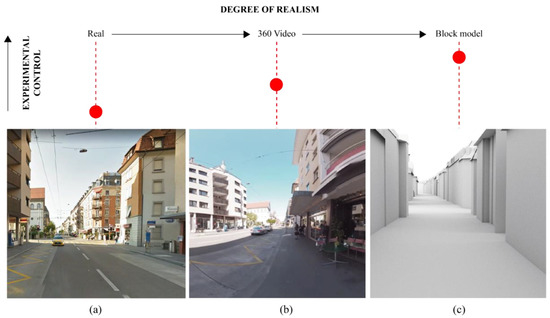 More precisely, in the field study (study 1), every participant experiences different soundscapes, weather conditions, objects along the way. By using a 360-degree video of the path (study 2), the soundscapes, illumination, and visual scenery remained the same for each participant, while some factors, such as temperature and movement, were cancelled out. This allowed a controlled replication of the field study in the virtual laboratory, as virtual environments are feasible methods to represent the real world [60]. Similarly, we used an abstracted geometry model to remove effects of different materials, soundscapes, illumination, and greenery to measure effects of urban form in isolation from other factors (study 3). Figure 7 indicates the underlying idea of reducing environmental variables to enhance experimental control.