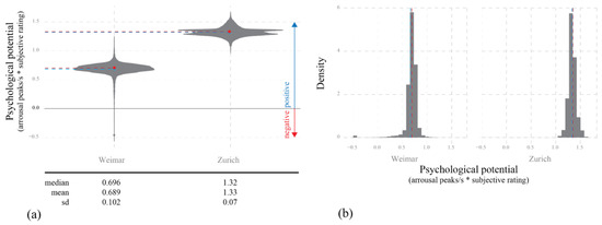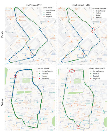 As described before, in the VR studies alongside the physiological response, we also recorded the environmental appraisal (liking or disliking a scene) using the clicker (cf. earlier). When a participant did not press one of the clicker buttons, the corresponding input was taken as no preference. The results of these subjective environmental appraisals are displayed in Figure 9. Many participants evaluated many of the city scenes as neutral. In Zurich, positive evaluations mainly occurred in areas with green space (park or trees along the street). This result would be in line with earlier suggestions [62] and research [43] indicating intrinsic preferences for nature [45]. In Weimar, the positive evaluations mainly occurred in the slightly winding streets through the historic urban structure. There were no negative ratings for Zurich from the 360°-video and only one negative rating in the geometry model at a larger junction, where, in reality, large trees enclose the space. For Weimar, there were two negative evaluations in both studies. In the 360°-video, these occurred once on a high traffic street and the other on a junction where one crosses a wide street. In the geometry model the negative evaluations occurred at a larger traffic crossing (where the open space is similarly unenclosed as in the Zurich street junction) and at the main inner-city retail streets, which most inhabitants regarded as beautiful.