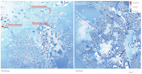 Extrapolated (from path to district) predictions of the psychological potential based on the decision tree predictive model for Weimar (left) and Zurich (right). The prediction combines the subjective ratings and the physiological arousal to estimate the size and the direction of the psychological potential of urban form (from negative-dark red to positive-dark blue).
