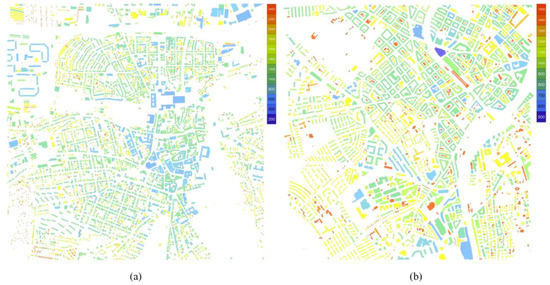 Finally, it must be noted that the adopted angular segment map model for estimating pedestrian movement flows is based on few parameters. On the one hand it allows model simplicity, i.e., only information on the street network is needed to accurately predict complex human behavior [30], but on the other hand, can be a source of bias [31]. Therefore, these assumptions—namely that building densities follow the street network centrality and that every segment is equally important as origin and destination of movement must be cautiously evaluated prior to any analysis. In general, they tend to hold true for historically grown cities, which was also confirmed by our previous studies [28]. Therefore, we adopt the simple angular segment map model based purely on street segments as this has shown a high predictive power for our case studies and is more suitable for our overall goal to inform early planning stages.