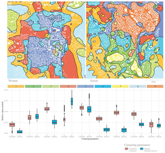 Finally, we developed a methodology to investigate trade-offs between the different potentials. For this, the results of the different potentials were mapped on one common analysis grid. We used this grid to identify different types of urban form. We used building intensity and closeness centrality for a k-means clustering analysis which could identify classical urban typologies. Since both cities identified similar typologies, it would be interesting if this also holds true for other cities.
