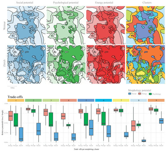 The article is structured as follows: First, we introduce the methodological frameworks for evaluating the psychological, the social, and the energy potential of urban form. In each section, we briefly review the state of the art in the field, explain the methods, and display the key results of each section, which is a map of the potentials for each of the two cities. Second, we explore the trade-offs between the three different potentials. Therefore, we present an approach for identifying distinct urban form clusters for which we analyze their social, psychological, and energy potential. Finally, we discuss the different trade-offs between the social, psychological, and energy potential of these urban form clusters and give recommendations for future work.
