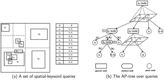 An example is given for illustrating the structure of AP-tree in Figure 1. As we can see, given a set of spatial-keyword queries Q shown in Figure 1a, an AP-tree (shown in Figure 1b) is constructed by employing keyword partition and spatial partition methods to recursively divide Q in a top-down manner. In our example, the spatial partition first is chosen to generate one -node with four cells as the spatial partition is more beneficial to pruning data objects than keyword partition based on the query workload in Figure 1a. Then, according to the queries assigned to in -node (i.e., , , , and ), one keyword node -node with three cuts (i.e., [], [, ], and []) is created by keyword partition. Meanwhile, a spatial node -node with four cells is generated based on the queries in (i.e., and ). In addition, the cell and link to two , respectively.