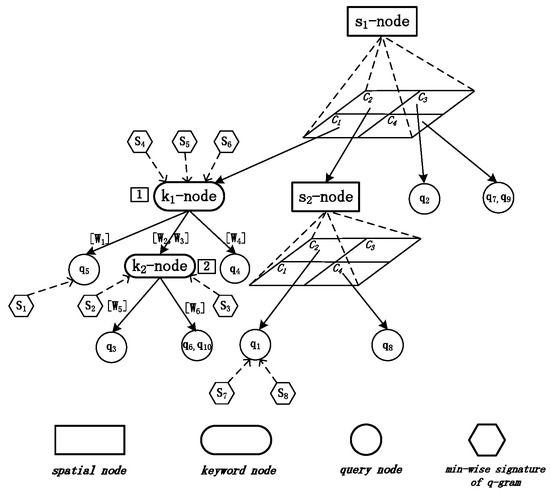 Using Equation (4), we can only store the signature of q-grams of each keyword instead of q-grams to reduce the storage cost of AP-tree. However, for the case that there are multiple keywords in one cut of one keyword node, there still exist multiple signatures. We can further reduce the space cost by merging multiple signatures into one signature based on Equation (6). Let be a q-gram set of keyword W, the scheme is illustrated in Figure 2. We store signatures of q-grams of keywords in query nodes and keyword nodes. For example, for one holding with a keyword set , , we only store that represents the signature of since has been indexed in -node. Similarly, for anther holding with a keyword set , , due to the reason there no any keyword node that hold and among its parent node and ancestor nodes, we store signatures of both and (i.e., and ) into this . On the other hand, for , we directly store the signature of q-grams of the keyword if there is only one keyword in one cut, while the signature of union of q-gram sets of these keywords is held if there are more than one keyword in one cut. For instance, -node has two cuts (i.e., [], []), thus we input the signature of (i.e., ) and (i.e., ) into -node. For -node with three cuts (i.e., [], [, ], []), we input three signatures (i.e., , , ). Among three signatures, is the signature of , is the one of ⋃ , and is the signature of .