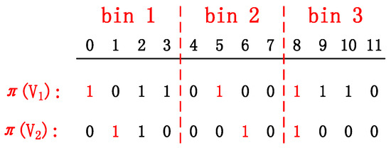 In the aforementioned method, we employ a family of ℓ independent permutations F to create signatures of q-grams. However, the major drawback of this hashing method is the expensive preprocessing cost, as the method requires applying a large number of permutations on the data [29]. For example, in [14] ℓ = 50 permutations have been used for constructing a MHR-tree. According to our previous works, the continuous queries hold dynamic property [30], thus AP-tree may suffer from frequent updates, as a result, the signatures need to be frequently recomputed as well. To address this problem, we used an one-permutation hashing method in [15] to generate signatures instead of ℓ permutations. The one-permutation method breaks the space evenly into ℓ bins, and stores the smallest nonzero in each bin, instead of only storing the smallest nonzero in each permutation and repeating the permutation ℓ times. For example in Figure 3, consider two sets of q-grams , ⊆ U with D = 12, a sequence of index of one permutation from U is defined as I = {0,1,…,11}, , are two binary (0/1) data vectors for representing locations of the nonzeros in . We equally divide the sequence I into three bins and find the smallest nonzero element in each bin to generate () = [0, 5, 8] and () = [1, 6, 8]. Finally, we can get three signatures of from () (i.e., 0, 5, 8 ) and three signatures of from () (i.e., 1, 6, 8).