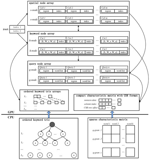 For each , m cells are in turn input into the . Each cell consists of one region reflects its spatial area and one index that points to one corresponding child. Since one child node in AP-tree may be one , or , the index in the may represent one index in the spatial node array, keyword node array or query node array. Similarly, for each , l cuts are in sequence filled into the . Since are generated based on an ordered keyword trie, we also map an ordered keyword trie into GPU memory. Concretely, we use m one-dimensional arrays to store m levels of one ordered keyword trie. Thus, every cut in the holds a pair of <index, triple>. The index has the same function as the index in . The triple is denoted as (L, , ), where L presents the level, is the lower boundary keyword and is the upper boundary keyword in the L-th level of ordered keyword trie. Furthermore, for each query node, n queries at most can be filled into a . Each query holds two parts: a that represents its spatial area and a contains a set of keywords. Noted that, all keywords in both and are represented by signatures as well.