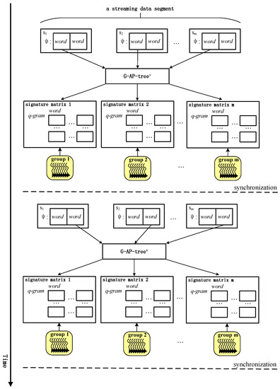 During the parallel computing procedure, however, the efficiency of similarity computing of keywords between queries and data tuples based on hashing is a problem. We proposed a parallel scheme for solving this issue. The parallel scheme is shown in Figure 5. For simplification, we assume that each data tuple (1 ≤ i ≤ m) has two keywords. Thus, we first construct m in parallel based on the first keywords of and the keywords from the of G-AP-tree. Each stores signatures of q-grams of keywords from both the streaming data tuple and queries in G-AP-tree. All are constructed in parallel as well. The construction procedure of one is shown in Algorithm 1.