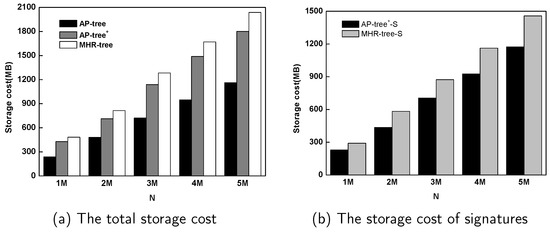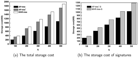 In this experiment, we investigate storage cost of AP-tree. AP-tree and MHR-tree are used for comparison. For MHR-tree, the number of hashing functions ℓ = 50 according to the experiments in [14], while the AP-tree used one-permutation hashing method.