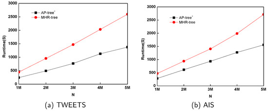 Figure 9 shows that AP-tree outperforms MHR-tree in terms of maintenance cost. As N changes from 1 M to 5 M, the ratio of update time of AP-tree to the one of MHR-tree is 53.15% and 63.52% on average, respectively for TWEETS and AIS. The great performance gains lie in that MHR-tree used ℓ = 50 hashing functions to generate signatures while AP-tree only employed one hashing function to do so during the update procedure of indexing structure.