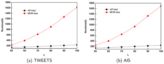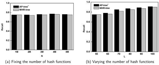 We first compared the recall of AP-tree with the one of MHR-tree with 50 hashing functions over a data stream (see Figure 11a). Then, given a streaming data segment whose size = 1 M, we also measured the recalls of both AP-tree and MHR-tree with various numbers of hashing functions (see Figure 11b, the number of hashing functions L ranges from 50, 60, 70, 80, 90, to 100). Figure 11a,b show that AP-tree has one comparable recall with the one of MHR-tree. The reason is that the one-permutation-based min-wise hashing can achieve similar or even better accuracies compared with the multi-permutations-based hashing algorithm.
