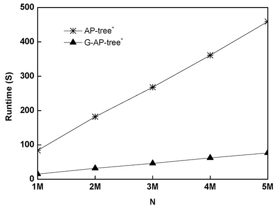 Like in [14], we also first employ the evaluation metric to measure the query accuracy of AP-tree. Then, we evaluate the CPU of AP-tree filtering streaming data. The MHR-tree is employed as one baseline. We use a TWEETS query set Q with = 500 K for these experiments. Since we run multiple continuous queries over a data stream with N data tuples in our case, the is defined as Formula (7).