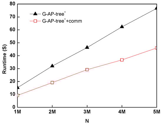 In this experiment, we measure time overhead of G-AP-tree with the communication scheme (denoted as G-AP-tree +comm). We again map an AP-tree with a TWEETS query set Q whose size = 500 K into the GPU memory to form a G-AP-tree. Then, we compared the of filtering a stream with N data tuples of G-AP-tree and G-AP-tree +comm. According to the experimental results in Figure 15, as the number of streaming data N increases, G-AP-tree+comm can improve the query performance by 39.4% compared to G-AP-tree. The reasons that the communication optimization can accelerate the procedure of filtering streaming data are because of overlap between computation and data communications, the volume reduction of CPU-GPU data communications and coalesced accesses to GPU memory by placing the input data of consecutive threads in interleaved data segments.