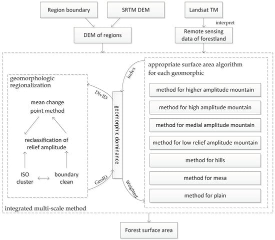 We established an integrated multiscale method of calculating forestland area via the optimum combination of geomorphic regionalization and surface area calculation methods; thus, the forestland area of China was calculated. The technical route is shown in Figure 1.
