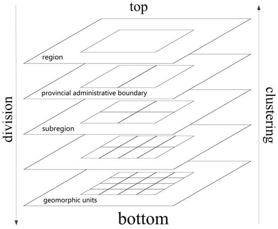 Geomorphic regionalization divides a region into different sub-regions according to the similarities and differences of the geomorphic areas based on the principles of relative consistency and geomorphic integrity. Geomorphic aspects mainly include elevation, relief amplitude, etc. The relief amplitude is an important index for quantitatively describing the geomorphology and for classifying geomorphic types [,]. This parameter represents the height difference between the highest and lowest points in a certain area. Therefore, relief amplitude is the most relevant to this study, and we selected it as the index for division and used the system clustering analysis method, which combined bottom-up clustering and top-down division (Figure 2), to determine every geomorphic area and the associated boundaries and achieve geomorphic regionalization of large areas.