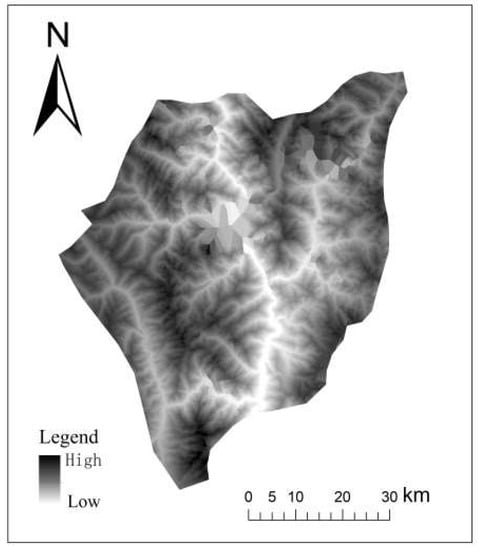 Shuttle Radar Topography Mission data are available from the United States Geological Survey (USGS) website (https://earthexplorer.usgs.gov/), which is an international research effort that provides land elevation data for over 80% of the globe. The effort was conducted by the US National Aeronautics and Space Administration (NASA) and the US National Geospatial-Intelligence Agency (NGA). The SRTM 1 Arc-Second Global used in this study provides high-precision terrain grid data with voids filled. Its horizontal datum is WGS84, vertical datum is EGM96, and spatial resolution is 1 arc-second (approximately 30 m) [].