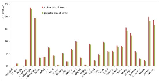 Comparison of the projected area and surface area of forest of each province.