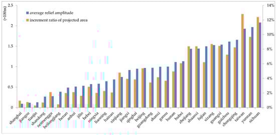Provinces in the above charts are sorted by the average relief amplitude. As shown in the analysis in Figure 11 and Figure 12, the change in the statistical area is generally similar to that of the projected area. Some provinces, however, have changed, and we speculate there may be two reasons for the differences: (1) most forests in provinces, such as Henan, are distributed in the plains and low relief amplitudes are correlated with small area increment; (2) urban provinces, such as Shanghai and Jiangsu, along with mainly desert provinces, such as Neimenggu, Ningxia, and Gansu, have small areas of trees that are accounted for in the statistical data but may be underrepresented in the classification of the interpretation of the remote sensing data.