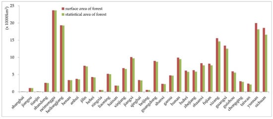 The remote sensing images used in this study were from 2010, and the forestland area of each province in 2010 was determined and compared with the surface area (Figure 11 and Figure 12). Compared with the statistical data, the percentage increase in forestland area measured in this paper reached 4.91%, representing a previous underestimation of 106,763.76 km2. Based on the difference and increment ratios of the statistical area and the projected area (12,968.53 km2 and 0.60%, respectively), most of the distribution of forestland used in the calculation of the projected area and the statistical area overlap, and the above number of 106,763.76 km2 can be considered the underestimated area of forestland instead of a calculation error.