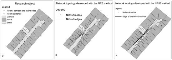The analyzed object was one floor of a building (Figure 1a). The network models generated with the use of classical methods, the NRS model (corridor–entrance), and the NRSE model (corridor–entrance–room) are presented in Figure 1b,c.