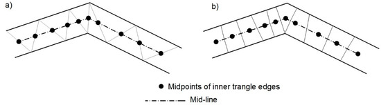 Lewandowicz and Lisowski [39] observed that greater segmentation of irregular corridors increases zigzagging in the generated network model. The use of midpoints {PMid} eliminates zigzagging in the MPRSS model (Figure 10).