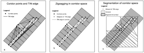 Segmentation of corridor space: (a) base points and Triangulated Irregular Network (TIN) edges, (b) zigzagging in corridor space and generation of midpoints {PMid}, (c) corridor segmentation with Voronoi diagrams (VDs) based on dataset {PMid}.