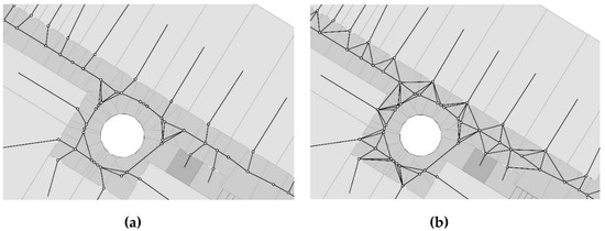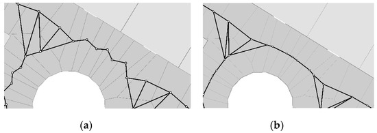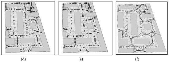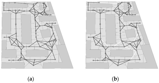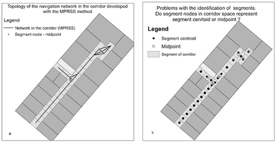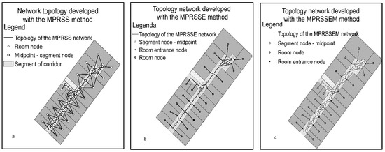 The MPRSSEM model was generated by modifying the MPRSSE algorithm. The (segment–room) relations from the MPRSS model were presented as (segment–entrance–room) relations in the MPRSSE model. As a result of the modification (Figure 5c), five edges of the MPRSSEM model do not fit the corridor space (marked in white) and had to be removed by the algorithm. An edge can also be added between each entrance and the adjacent segment of the corridor. In this case, there would be no edges marked in white in Figure 5c.