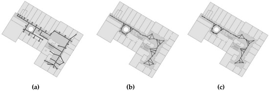Network models generated with the use of different methods: (a) manually generated models [41], (b) models generated with the use of the NRSS method based on segment centroids [39], and (c) models generated with the use of the MPRSS method based on midpoints of the zigzag line in the corridor.