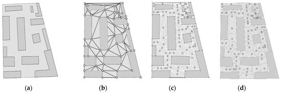 The adopted methodology was additionally verified in the space shown in Figure 11a, which can represent indoor premises or developed space. To generate the network automatically, open space was segmented based on the points representing the vertices of the main corridor elements. Selected fragments of TIN edges mapped to corridor space are presented in Figure 11b. The mapped edges were used to generate midpoints, {PMid}, (Figure 11c) and to segment corridor space (Figure 11d).