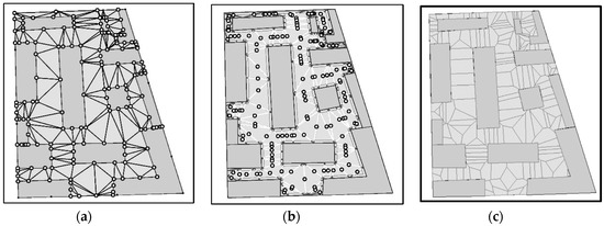 Other methods for generating models are based on structure segmentation. Delaunay triangulation algorithms for generating Triangulated Irregular Networks (TINs) [15,27] or Thiessen polygons, referred to as Voronoi diagrams (VDs) [1], are used for segmentation. Selected points from the analyzed structures (entrances, turn points in wall contour lines) are the basic elements for developing TINs and VDs. The network is constructed with the NRS method based on the segments generated from TINs and VDs. The centroids of the neighboring segments from TIN or VD are connected by edges [7,28]. TIN and VD polygons have also been applied to increase segmentation options [21,22,28]. In these solutions, navigation networks with different resolution are generated automatically subject to need. A network is developed based on the NRS method, but the structures are TIN triangles or VD polygons. The paths generated by network models based on TIN and VD segmentation are usually zigzag lines, which need to be simplified and smoothed with additional algorithms [29].