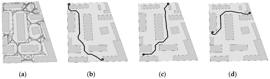 Paths generated in the MPRSS network model: (a) a network model generated with the MPRSS method for a larger number of base points in corridor space and (b–d) examples of paths generated between selected points.