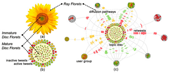 Icon method represents multiattribute trajectory data by using icons with multiple, easily identifiable features, each of which represents its corresponding univariate information. Specifically, icons map data attributes into different visual channels (icons, textures, colors and transparency, outlines, shapes, metaphors, etc.) and then combine them with other visualization stages in a reasonable manner, such as mixed rendering in the plotting stage, image fusion in the image-processing stage, etc. Figure 1 is the “Whisper” design by Cao et al. [2], which is based on a metaphor of a sunflower, tracing the paths from the source tweets to different groups of users who retweeted them.