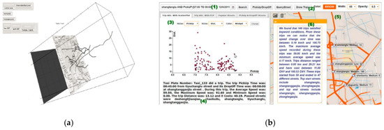 For each application domain, the trajectory has a set of specific features and requires an approach that provides the correct visual cues while integrating with different semantic data. In response to this work, Le et al. [11] proposed the first demonstrable interactive semantic visualization system, “SemVis”, which infuses visualization with latent semantics to build an application ontology. Each trajectory in the ontology is considered to have the following semantic attributes: (a) being located in one or several neighborhoods; (b) occurring during a specific day; and (c) possibly passing through some observation points in various traffic areas. Figure 5a presents a user-defined trajectory cube that associates the trajectory with recognized meaningful semantic dimensions. Furthermore, novel interfaces are required to transform abundant trajectory data into different spatial and temporal granularities. SemanticTraj, which was designed by Al-Dohuki et al. [12], enables an efficient visual exploration of taxi trajectories (see Figure 5b).