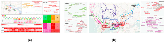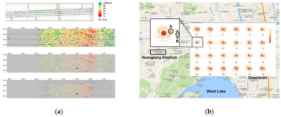 In recent years, the development of smart traffic management systems has built denser checkpoints on urban roads. Figure 6a shows trajectory information recorded by checkpoints for all vehicles per unit of time. Chu et al. [22] designed a novel VATT (Visual Analytics of Taxi Topics) system that transforms geographic coordinates in massive trajectory data of urban traffic networks into taxi topics with street clouds. Figure 6b shows the taxi topics generated from massive taxi-trajectory sets, which were ranked and labeled according to their importance from Topic 1 (high importance) to Topic 8 (low importance).