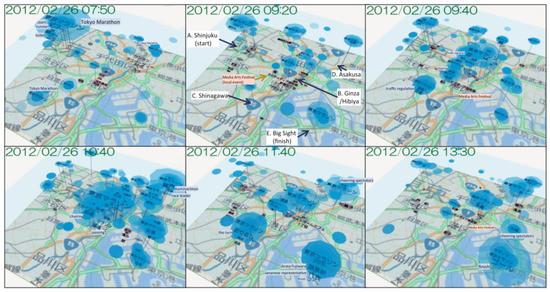 Multilayered spatial word-cloud visualization of the Tokyo Marathon on 26 February 2012 [24].