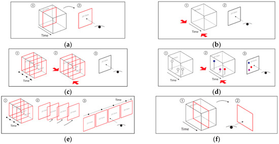 Figure 8. Static visualizations as space–time cube operations [27]: (a) time cutting; (b) time flattening; (c) discrete time flattening; (d) colored time flattening; (e) time juxtaposing; (f) space cutting; (g) space flattening; (h) repeated drilling; and (i) 3D rendering (image courtesy of Bach et al.). - Dynamic Visualization: Animation is the process of applying different operations on a space–time cube over time, or similarly, varying the operation parameters over time. The most common forms of animation involve changing the position of the cutting operation over time (i.e., animated time cutting). Spatial padding can be performed accordingly before the operation, producing smooth animated transitions. Animated time cutting can also be combined with other STC operations, such as time flattening. Although many animation techniques can be described as animated time cutting and its variants on a static space–time cube, other animation operations also exist. For example, Bach et al. [28] proposed animated 3D rendering, which interprets the transition between two space–time cube operations by smoothly rotating the space–time cube representation.