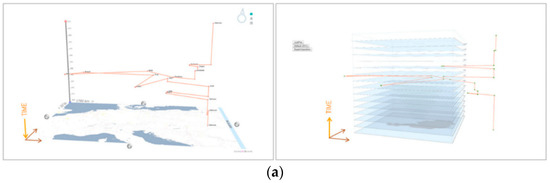 Many visualization systems apply space–time cubes, including Geo-Time [29], PolyCube [30], Tardis [31], VISUAL-TimePAcTS [32], Cubix [28], Wakame [33], etc. For example, Mayr et al. [30] extracted the recording locations and corresponding time stamps of biographical narratives, which were then injected into spatiotemporal visualization systems for further exploration (see Figure 9a). The correct choice of space–time cube operations involves a trade-off between analytically related space–time characteristics, such as the density or sparsity of a cube. The space–time path (STP) refers to a three-dimensional space–time path that combines temporal information and supports specific applications of each interactive operation. Figure 9b shows a space–time cube that narrates the “Crossing the Chishui River Four Times” event, a famous battle in the Red Army Long March in 1935. A time-slice technique was applied to visualize two-dimensional temporal snapshots that correspond to different temporal points in the three-dimensional scene, expressing the event status over time.