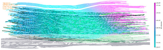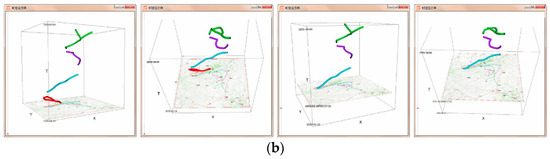 Many methods are applicable to the basic tasks of trajectory visualization, but the distribution and dynamics of attribute values in space and time are still unclear, especially when the analyst is interested in not only a single trajectory but also the entire trajectory set. Inspired by Tuan et al.’s [37] stacking of graphic elements, Tominski et al. [38,39] devised a solution that visualizes attribute values along stacked trajectories. As shown in Figure 10a, this approach stacks trajectory bands along the z-axis perpendicular to the map by a temporal order, while providing an exclusive layer on the z-axis for each trajectory. Therefore, this method avoids the possible intersection of trajectory bands (the right graph), which would cause problems when tracking attributes along the trajectories. To illustrate the utility of trajectory stacking, Andrienko et al. [40] explored a trajectory set with similar shapes in a 3D view, where the trajectory bands were divided into segments that were colored according to their attribute values (see Figure 10b).