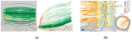 Examples of trajectory-wall visualization: (a) comparison between trajectory wall and space–time cube [38,39]; and (b) vessel movements in the North Sea [40].