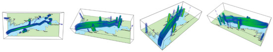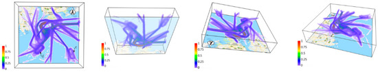 As introduced by Demšar et al. [44], the 3D space–time density of a trajectory is a generalization of the standard 2D kernel density around the 2D point data into the 3D density around the 3D polyline data (i.e., trajectories). Its fundamentals are first computing the density for each trajectory, which represents the influence of that particular trajectory on its nearest neighborhood in both space and time, and then adding these densities to obtain the total density for the entire dataset of trajectories. Demšar et al. also applied this approach to the analysis of vessel-movement trajectories in the Gulf of Finland. Their result (Figure 13) depicts the traffic characteristics of tanker vessels from four different perspectives.