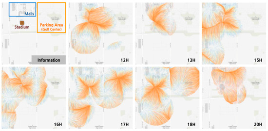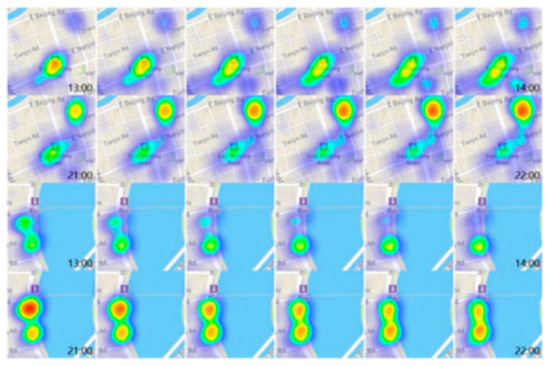 Interpreting the diffusion direction of mobile crowds can help urban designers optimize routes and traffic flows. Therefore, Li et al., from Hong Kong Polytechnic University, Hong Kong, China, proposed a StreamMap model [45] to smoothly blend high-density streaming points and create a visual flow that emphasizes the density-pattern distributions. To solve the over-plotting problem, a superpoint-based estimation method named super kernel density estimation (SKDE) is proposed to derive accurate density maps from the period of streaming point data by using adaptive kernel selection with a fast point-clustering method. Figure 14 depicts smooth morphing results of visualizing the pedestrian flow on 25 July 2015 at East Nanjing Subway Station via improved StreamMap model to detect flow trends.