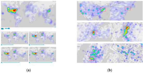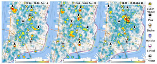 From the perspective of heatmap generation, three main plotting methods exist: influence superimposition, density grids [48], and sliding windows [49]. The influence-superimposition approach is simple and widely adopted. The basic idea is to map the geographic objects onto the geographical space as hotspots, each having a certain influence on its neighborhood (determined by the kernel function), and then sum the influence of each hotspot and convert the added results into colors to render, yielding a heatmap. Embedding geolocation information into datasets in social media benefits analyses on location-based public behaviors. In terms of spatiotemporal analytics, Chae et al. [50] used a geospatial heatmap to illustrate the spatial distribution and trend approximation of public movement flow in the disaster event of Hurricane Sandy in Manhattan, New York in 2012. Figure 16 shows their user-based spatial tweet distribution in Manhattan; such standard heatmap visualization enables analysts to explore the spatial patterns of Twitter users at any given time.