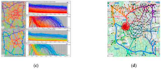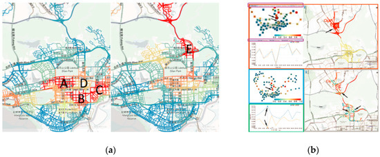 TrajGraph is aggregated by graph partitioning to represent region-level information, which calculates two indicators of “pagerank” and “betweenness” and merges real traffic information carried by taxi-trajectory data to reflect urban network structures. Figure 19a provides two examples of how the centralities reveal the transportation patterns of Shenzhen. Furthermore, TrajGraph effectively facilitates the interactive visual reasoning of real traffic conditions. As shown in Figure 19b, analysts may filter display areas by scoping city-wide graphs and zooming in graph views, acquiring contrary or similar temporal variations in the betweenness centrality of the day and further displaying the pagerank values of their different timelines to determine where urban bottleneck areas are located. If this pattern recurs for several days, then a solution should be sought in terms of urban planning or traffic control.