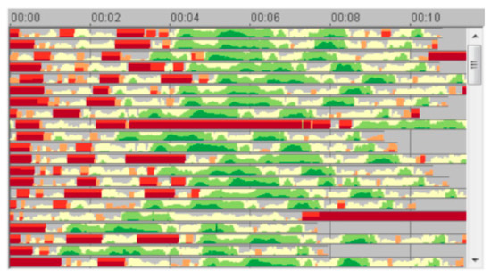 Time-oriented data are typically defined as streaming data. In particular, streaming point data are a type of streaming data that store geographical positions, which also involves a portion of the trajectory data. Li et al. [52] proposed a perceptually optimized method to dynamically visualize high-density streaming points and introduced two extended interactions for the visualization of large point sets—stream player and hierarchical interaction. A stream player is an interactive environment for users to easily browse the results by playing a stream. Each calculated sequence is stored as an image, whose interpolation is dynamically calculated according to a linear function. Therefore, switching from one sequence to another is efficient (see Figure 18a). Zooming is an essential feature in interactive visualization. Users cannot browse all the details at the same time because the pipeline aims for large point sets. Hierarchical interaction was therefore developed, that is, sampling the dataset according to the current scale level and constructing a quadtree structure for the high-speed query of datasets in the selected area. Figure 18b shows six perceptual heatmap results at different levels of detail.
