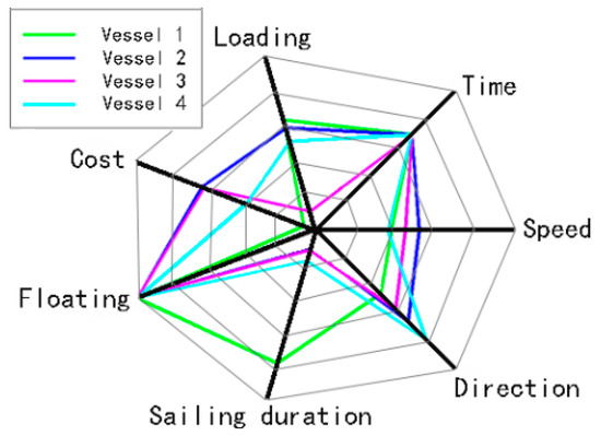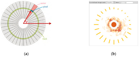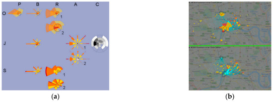 To intuitively reflect spatial distribution and multidimensional attributes in path visualizations, Sheng [5] designed a wheel-metaphor icon based on a radial layout in an area attribute view, which corresponds to the candidate area and maps the multivariable attributes simultaneously. Meanwhile, mapping key areas to the icons of the attribute-visualization interface often requires the position updating of icons to alleviate visual cluttering caused by the distance reduction between the icons, or sequentially mapping grid areas according to the increasing or decreasing order of abscissas of the area centers, solving the node-overlapping problem. Figure 3 shows the mapping effect of certain key areas to icons in a certain period.