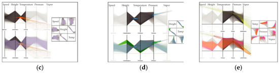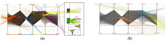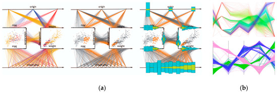 - Yuan, X.; Guo, P.; Xiao, H.; Zhou, H.; Qu, H. Scattering points in parallel coordinates. IEEE Trans. Vis. Comput. Graph. 2009, 15, 1001–1008. [Google Scholar] [CrossRef]