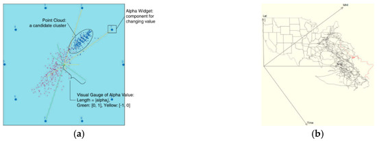 As the availability of larger trajectory datasets grows, the three-dimensional STPs in space–time cubes inevitably suffer overlapping and cluttering, both of which obscure the visual recognition of spatiotemporal patterns. The spatiotemporal clustering of spatial-trajectory datasets that focus on detecting people’s daily activity information can help explore the moments and locations of interactions. Figure 11a is a snapshot of numerous student tracks in a traditional STC visualized by Du et al. [41] that indicates the spreading risk of an epidemic disease, which demonstrates how the visual cluttering problem obscures the detection of any cluster.