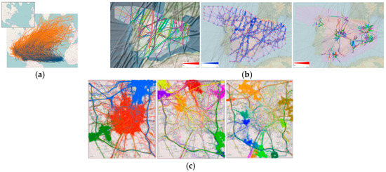 Examples of analyzing trajectory semantic patterns: (a) encoding downtown pedestrian trajectories by semantic types [11]; and (b) visually exploring taxi trajectories via SemanticTraj [12,13,14].